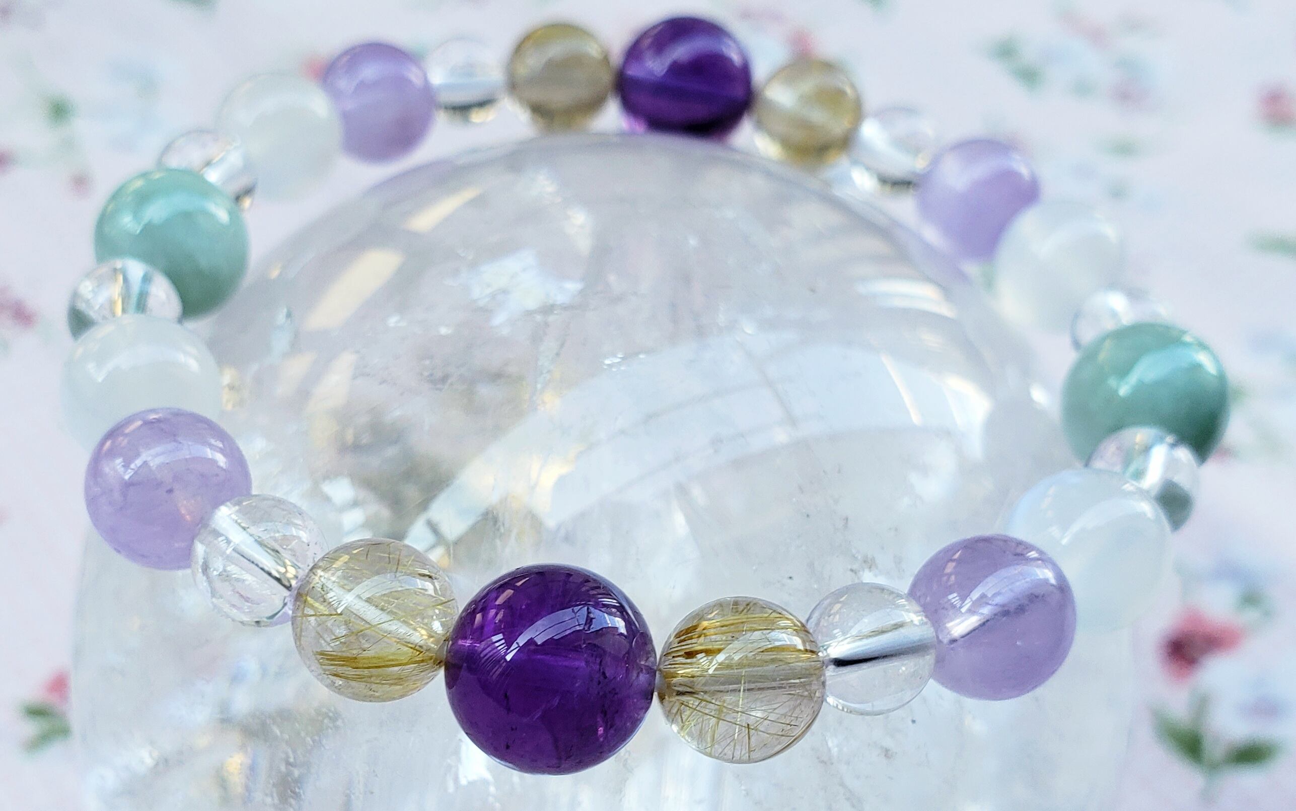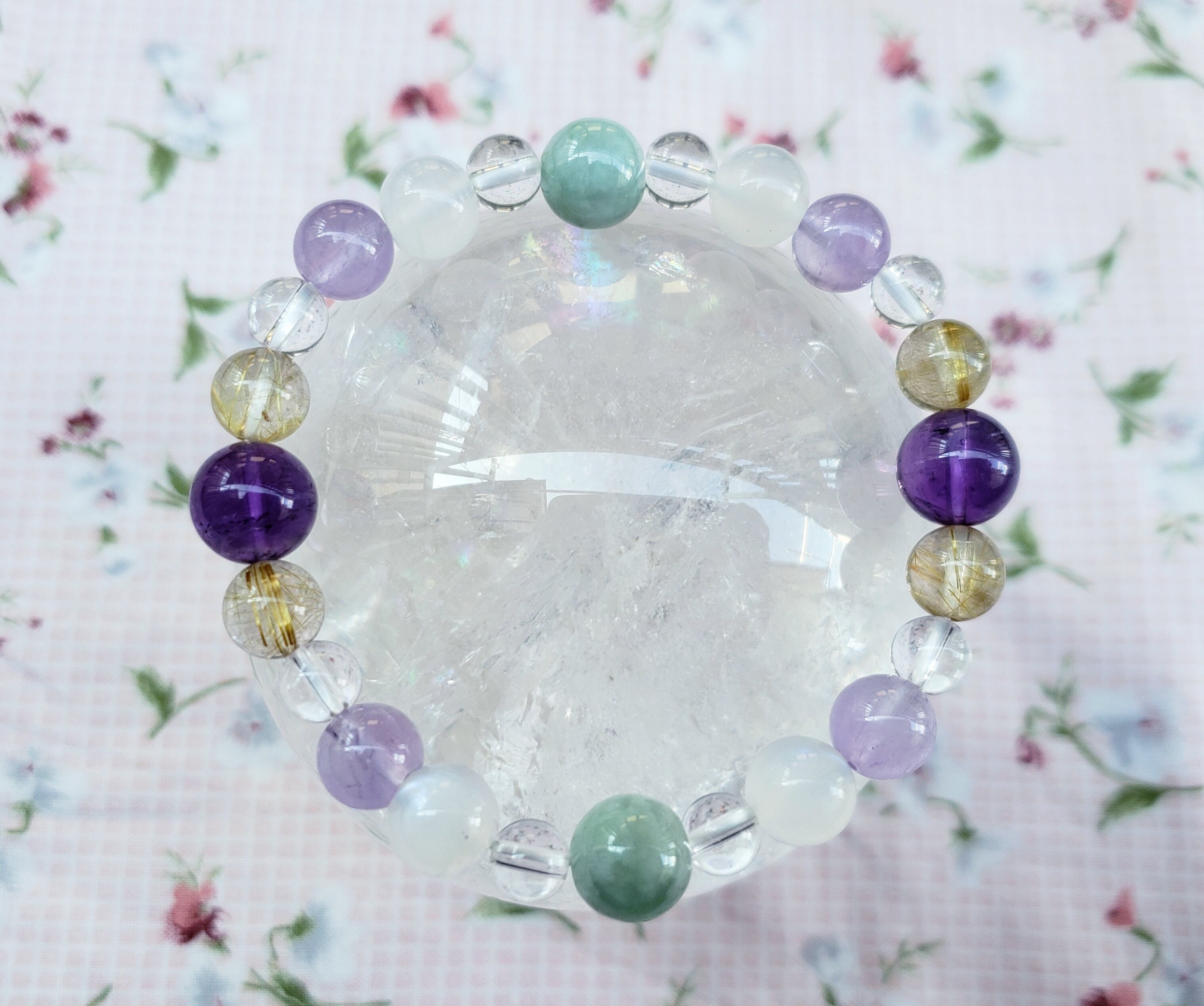 翡翠、ペリステライト、ラベンダーアメジスト、ルチルクォーツ、アメジスト、水晶のブレスレット