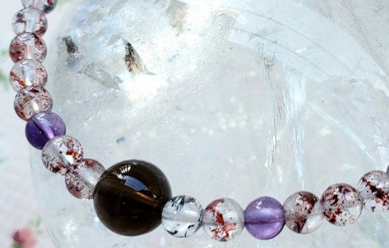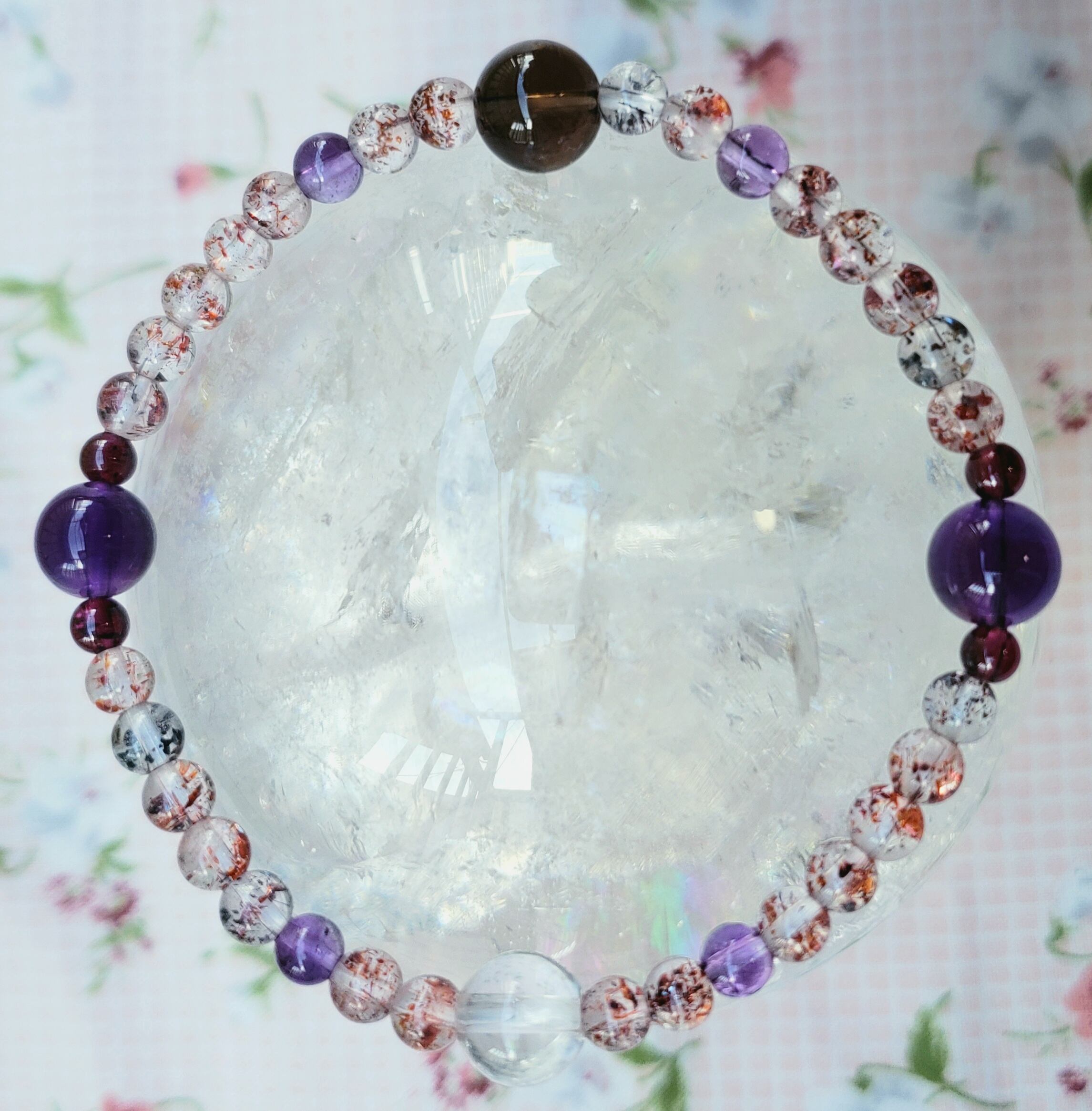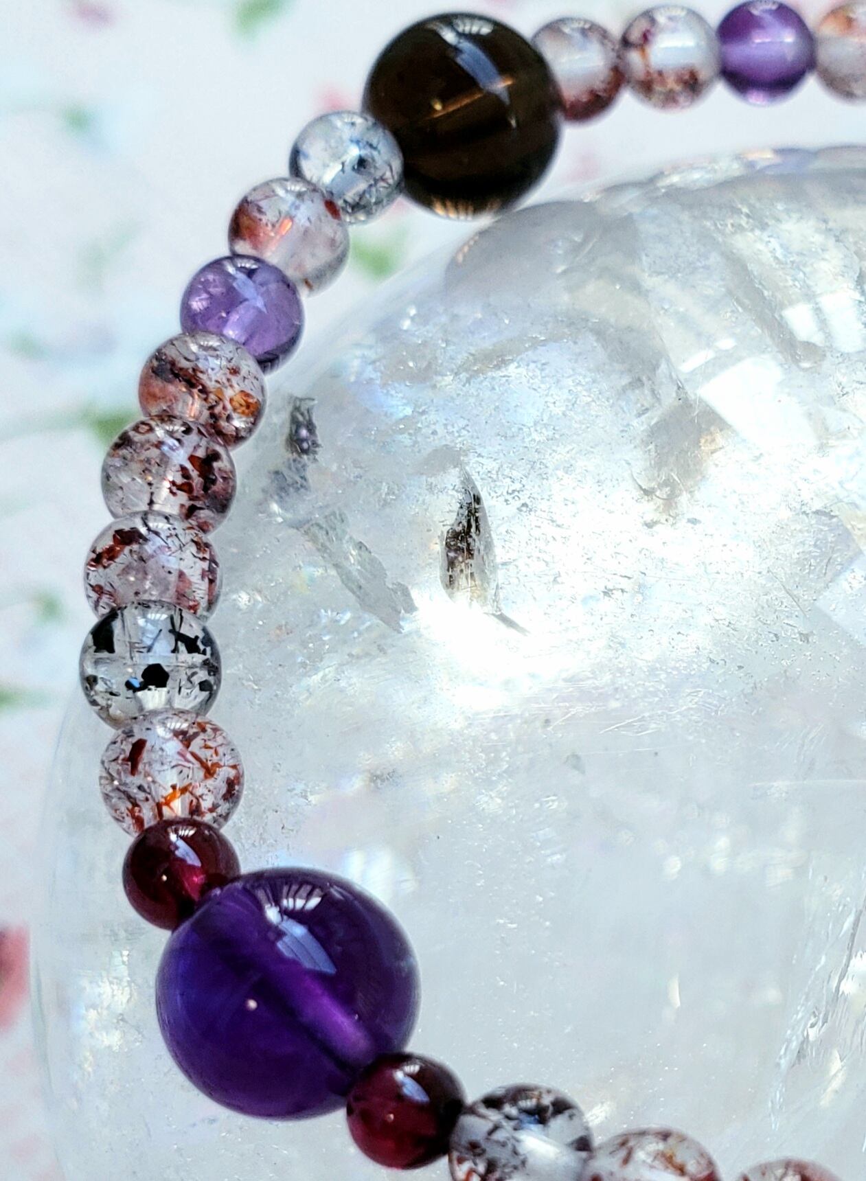 スーパーセブン、アメジスト、ガーネット、スモーキークォーツ、水晶のブレスレット