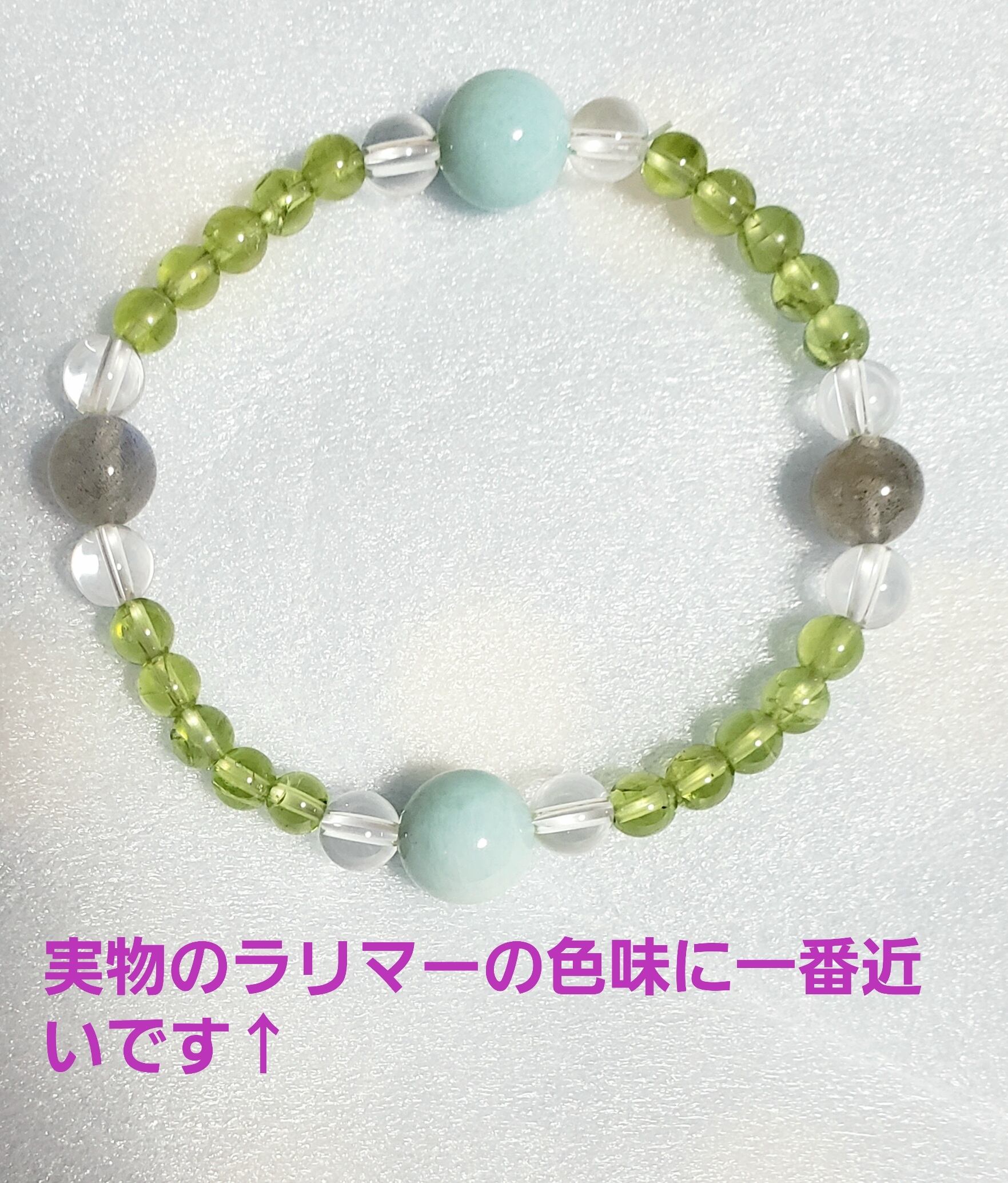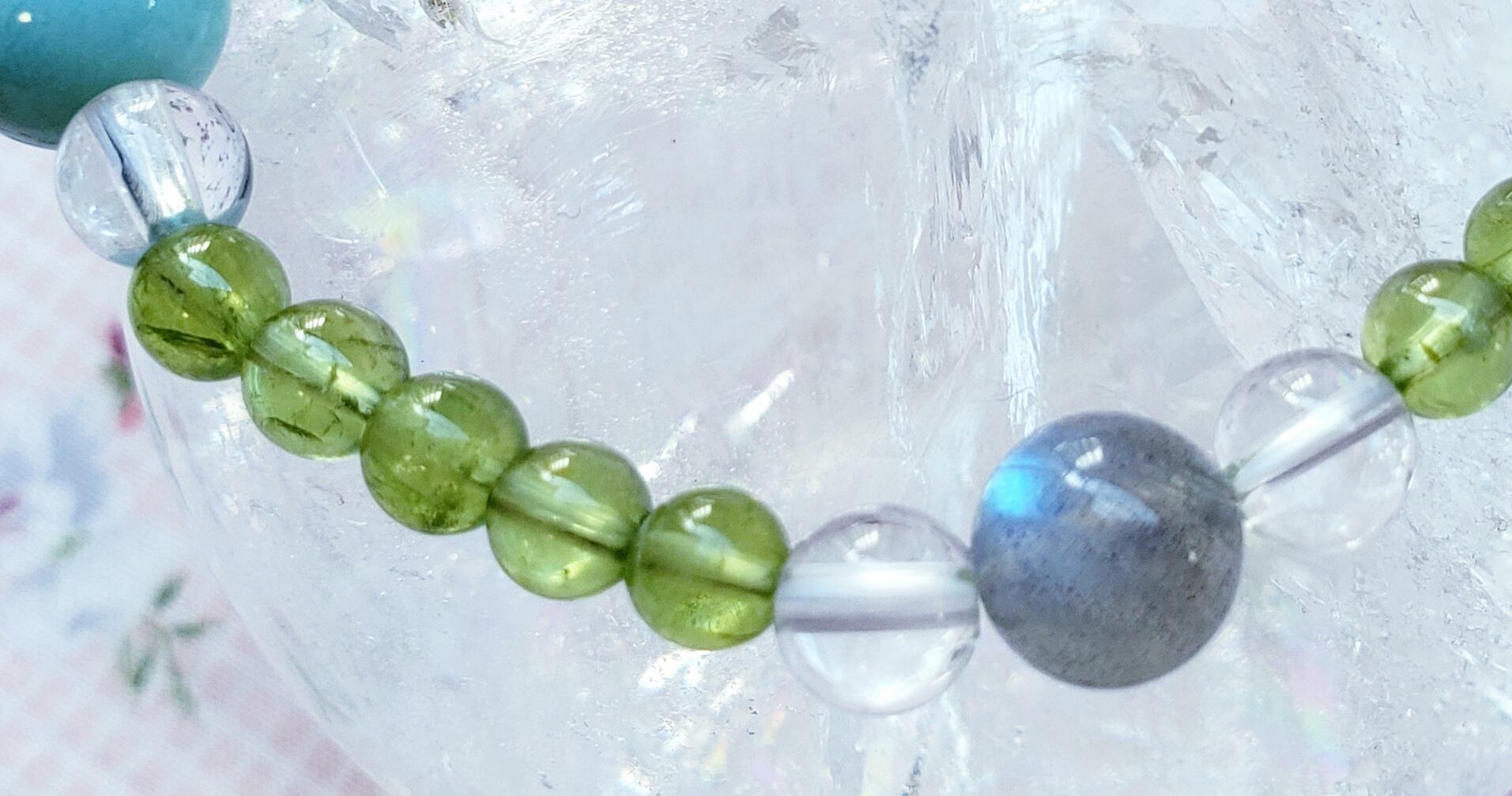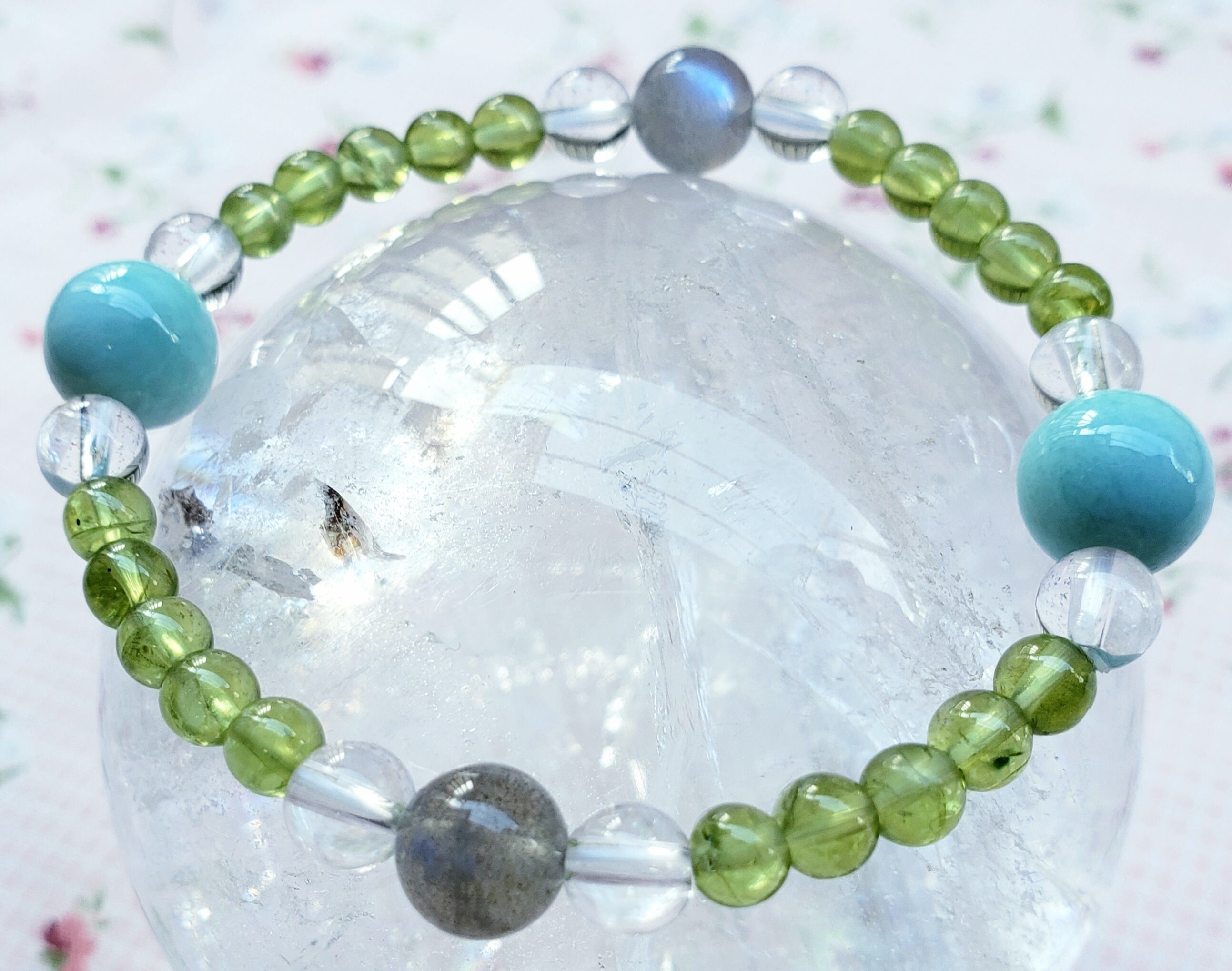ペリドット、ラブラドライト、ラリマー、水晶のブレスレット