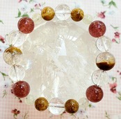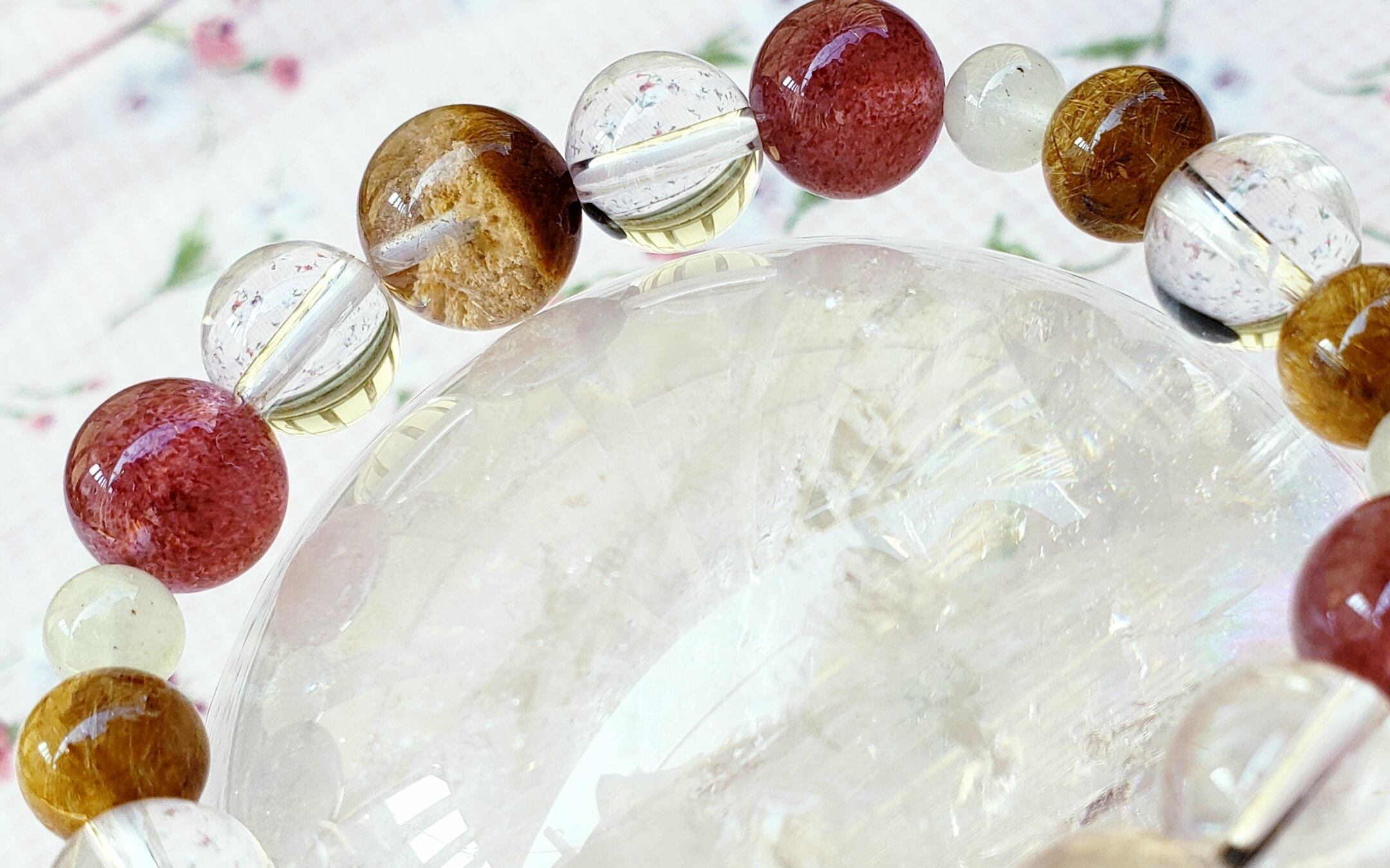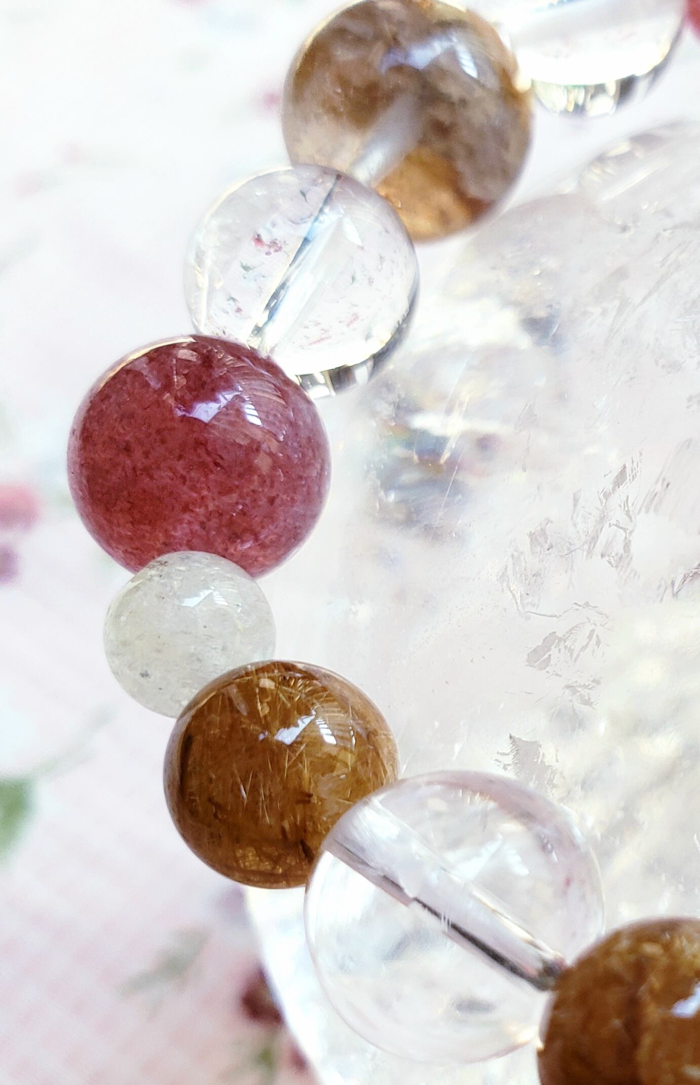ストロベリークォーツ、リビアングラス、ルチルクォーツ、ガーデンクォーツ、水晶のブレスレット
