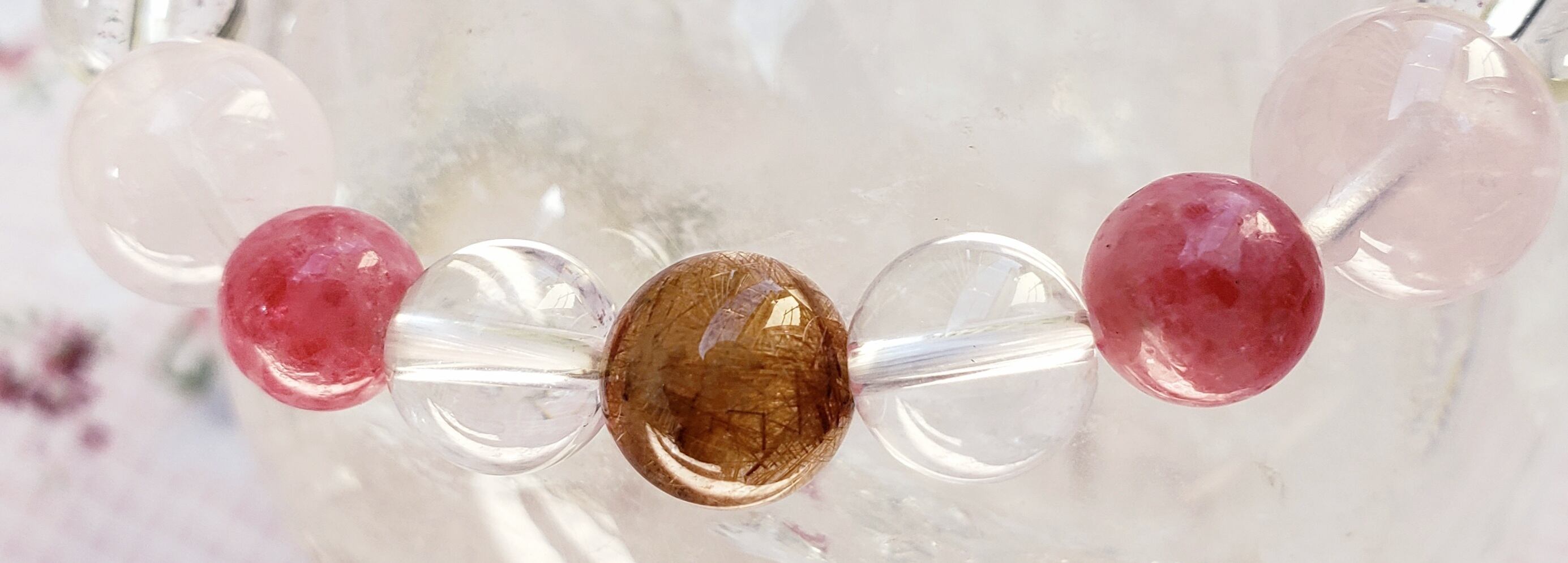 ゴールデンプレナイト、ローズクォーツ、インペリアルロードナイト、ルチルクォーツ、水晶のブレスレット