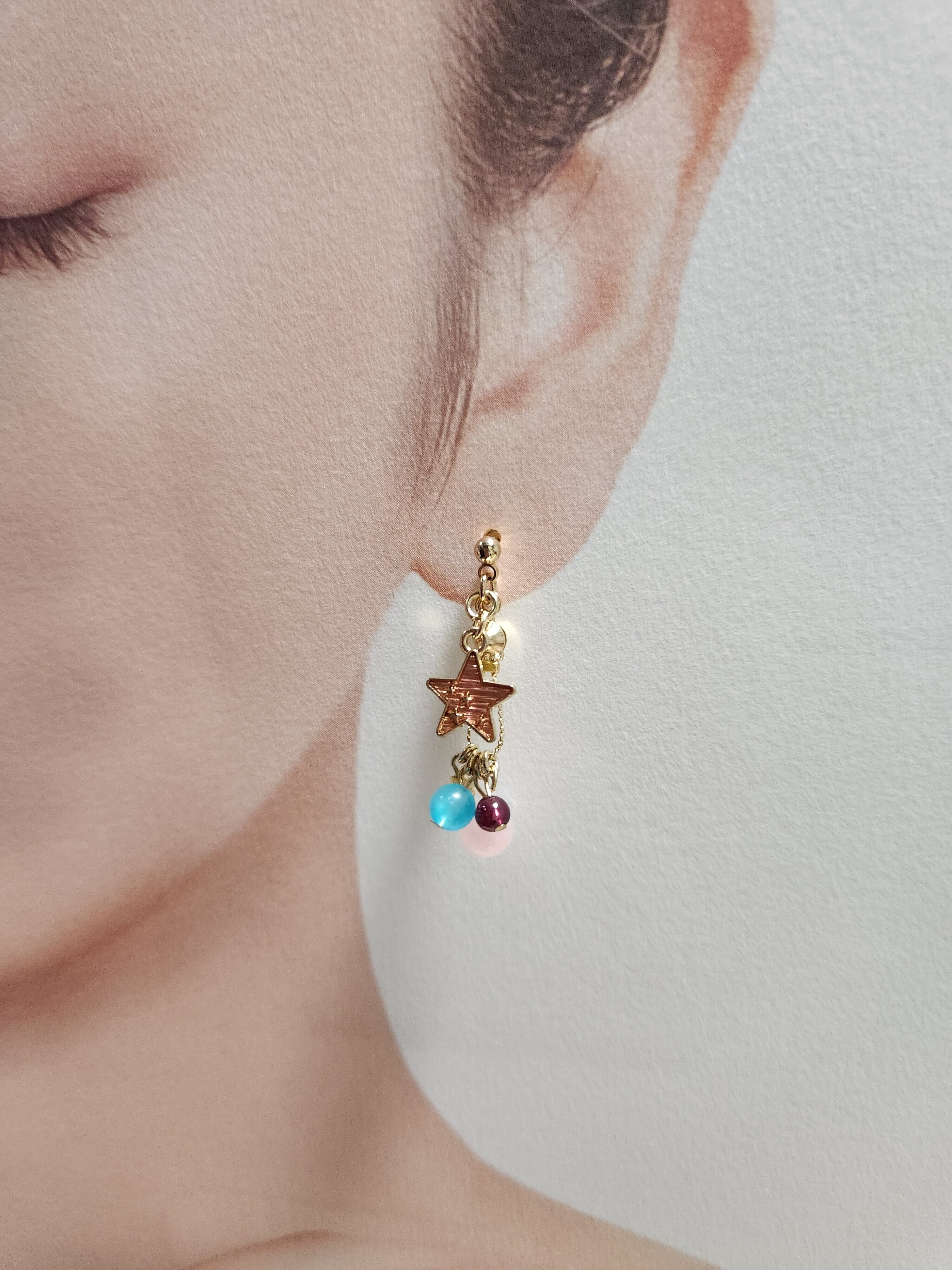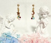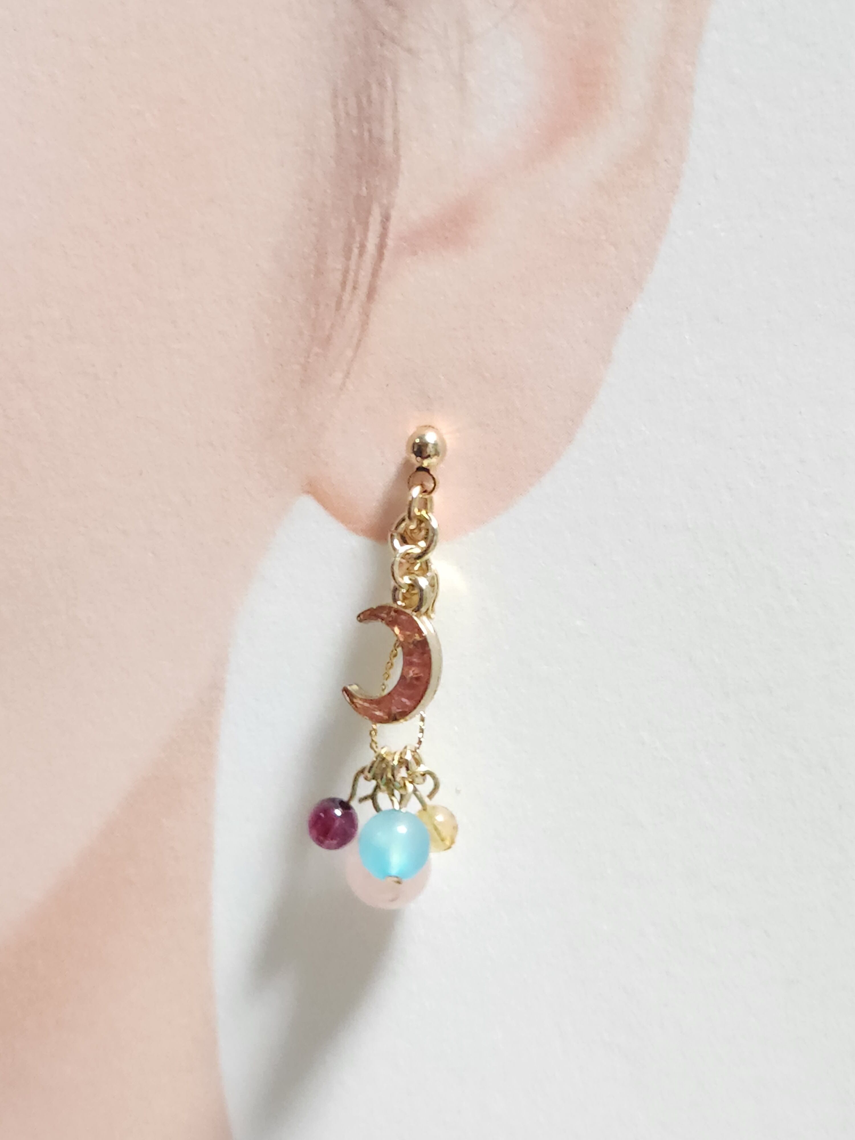 【月と星のピアス】ローズクォーツ、アマゾナイト、ルチルクォーツ、ロードライトガーネット